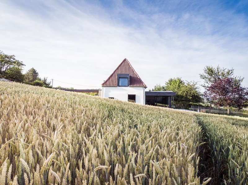 Le concept consistait donc, ici, rapidement à projeter une "galette" horizontale qui vient s'inscrire tout naturellement dans le paysage rural en déclivité légère. Cette dernière, s'articule perpendiculairement au volume principal de la longère. Ce geste fort crée ainsi une liaison forte entre le carport, l'habitation et la terrasse dans une seule et même continuité.